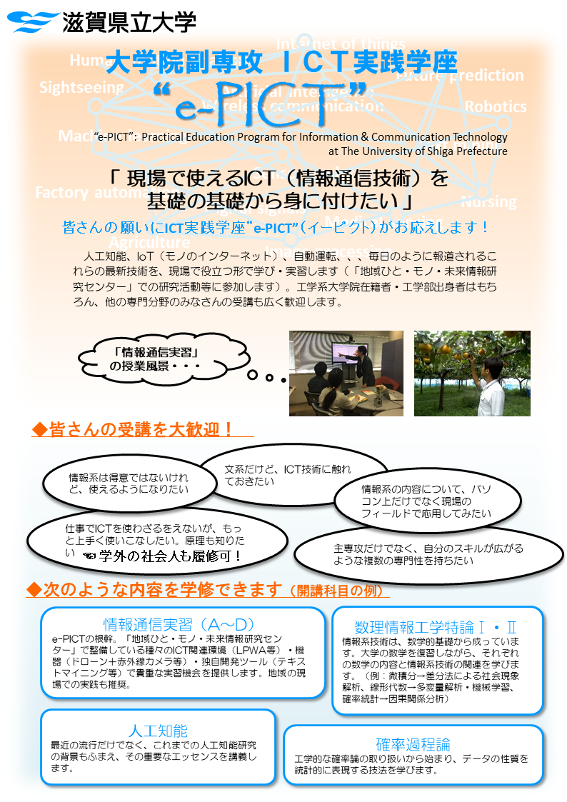 滋賀県立大学では、平成30年4月より、大学院副専攻として、「ICT実践学座“e-PICT”」(イーピクト)を開設しました。