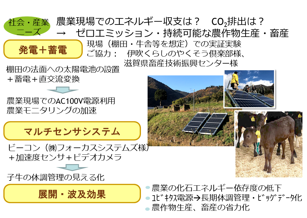 以上の研究について、棚田における農業のエネルギー自立については、伊吹くらしのやくそう倶楽部様の平成31年度と令和2年度の滋賀県地域エネルギー活動支援事業補助金による活動成果に基づくものであり、畜産における子牛のモニタリングについては、㈱フォーカスシステムズ様、滋賀県畜産技術研究センター様、工学部・電子システム工学科の宮城茂幸准教授と共同し、令和3年度滋賀県近未来技術等社会実装推進事業補助金の支援のもとで行われました。