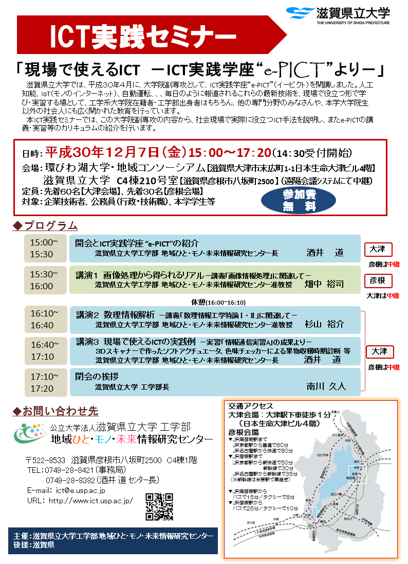 滋賀県立大学では、平成30年4月に、大学院副専攻として、ICT実践学座“e-PICT”(イーピクト)を開講しました。