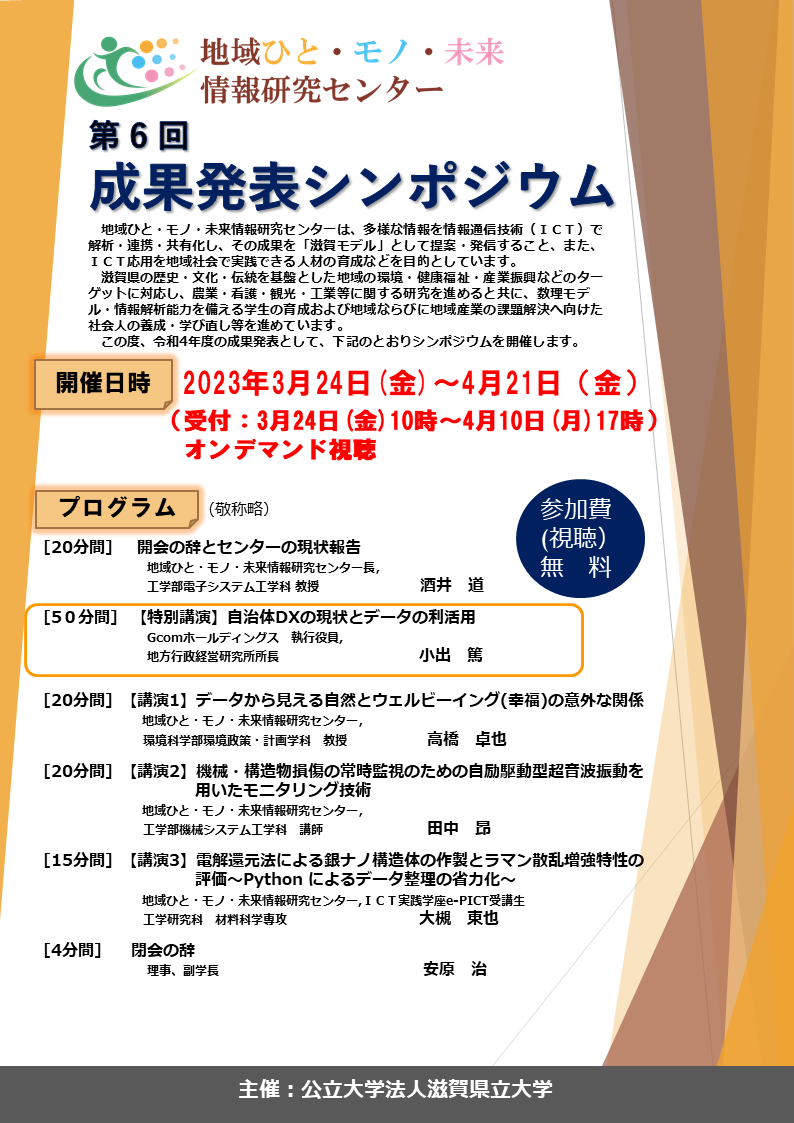 地域ひと・モノ・未来情報研究センター・第6回成果発表シンポジウム(オンデマンド配信)の受付ページです。