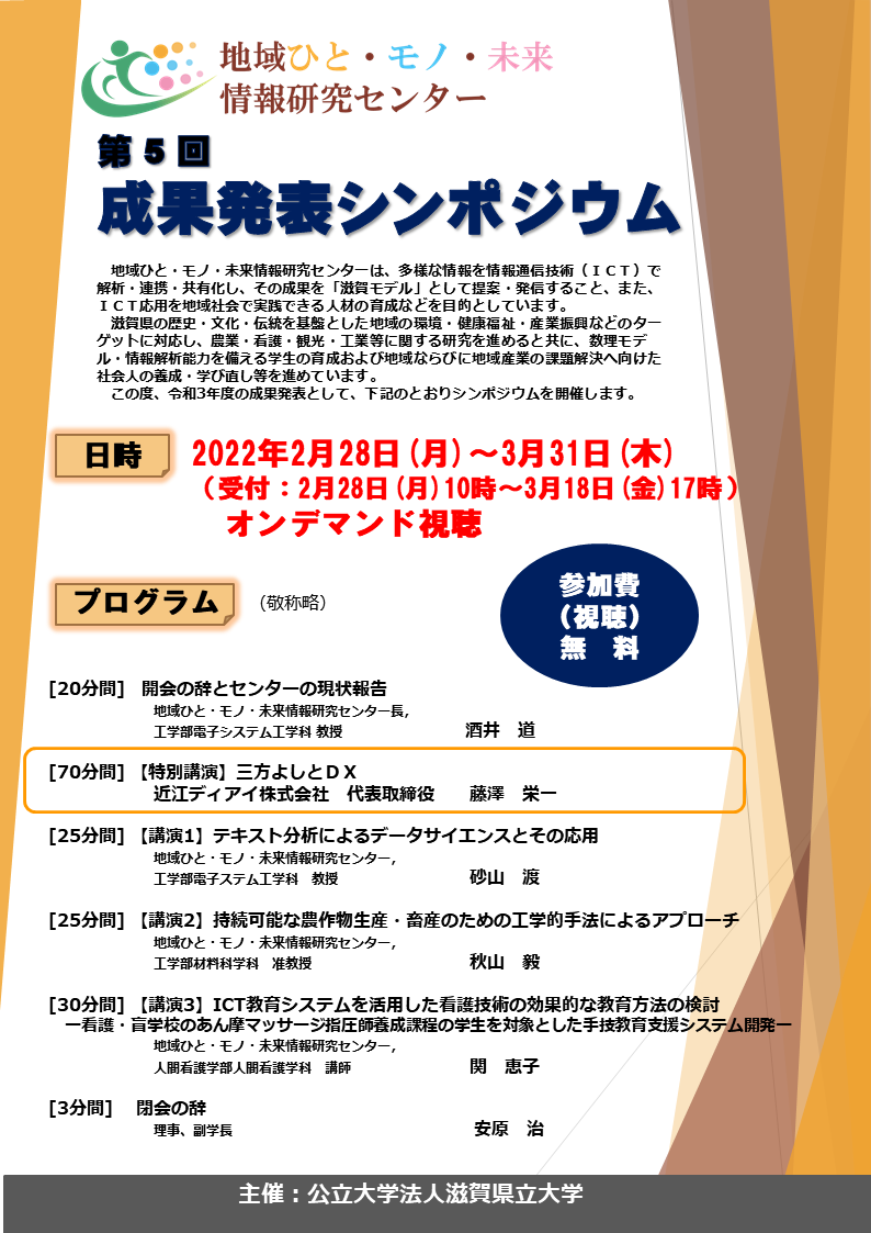 地域ひと・モノ・未来情報研究センター・第5回成果発表シンポジウム(オンデマンド配信)の受付ページです。